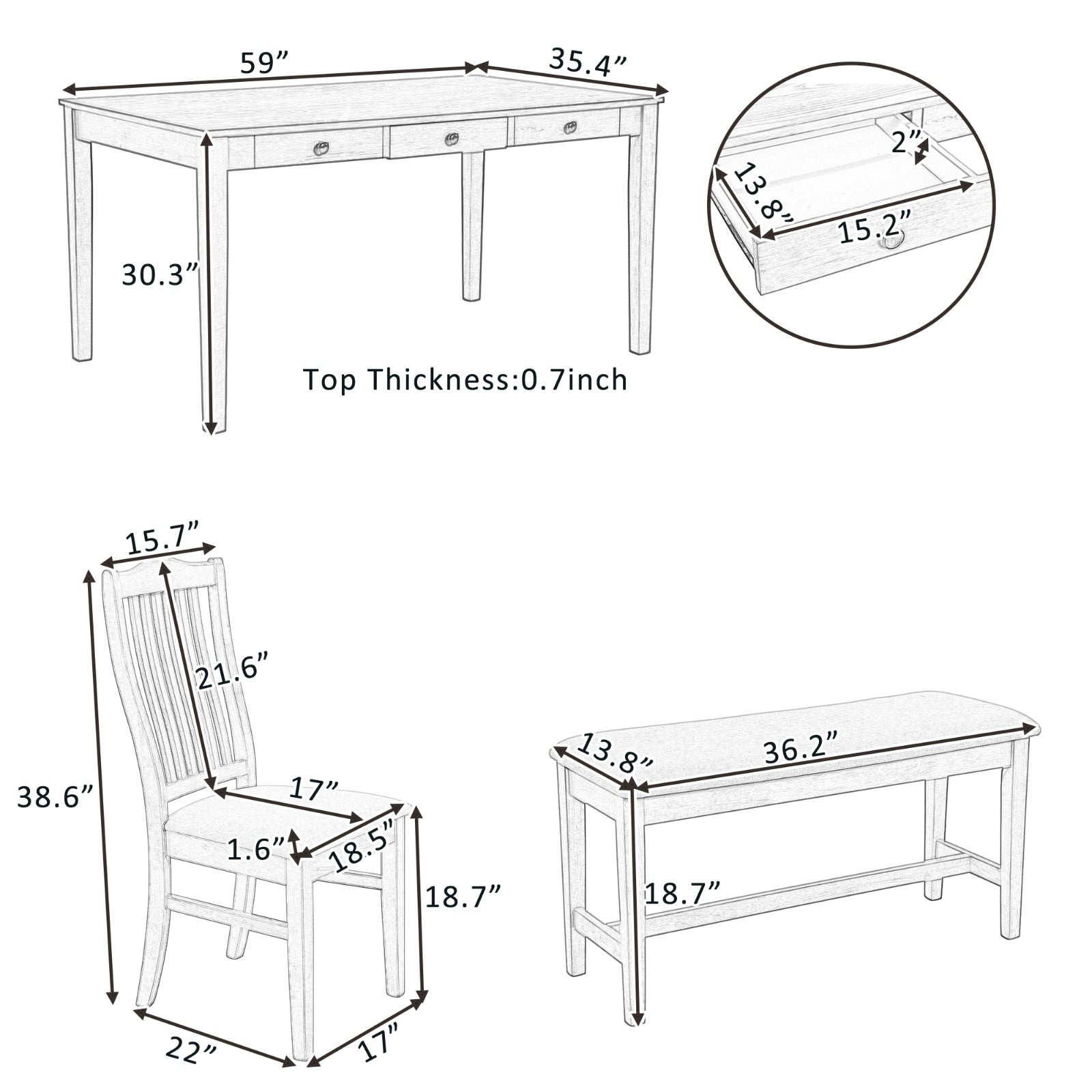 - Dimensions & capacity: Table 59" x 35.4" x 30.3"; chairs 22" x 17" x 38.6"; bench 36.2" x 13.8" x 18.7"; supports up to 250 lbs per seat.