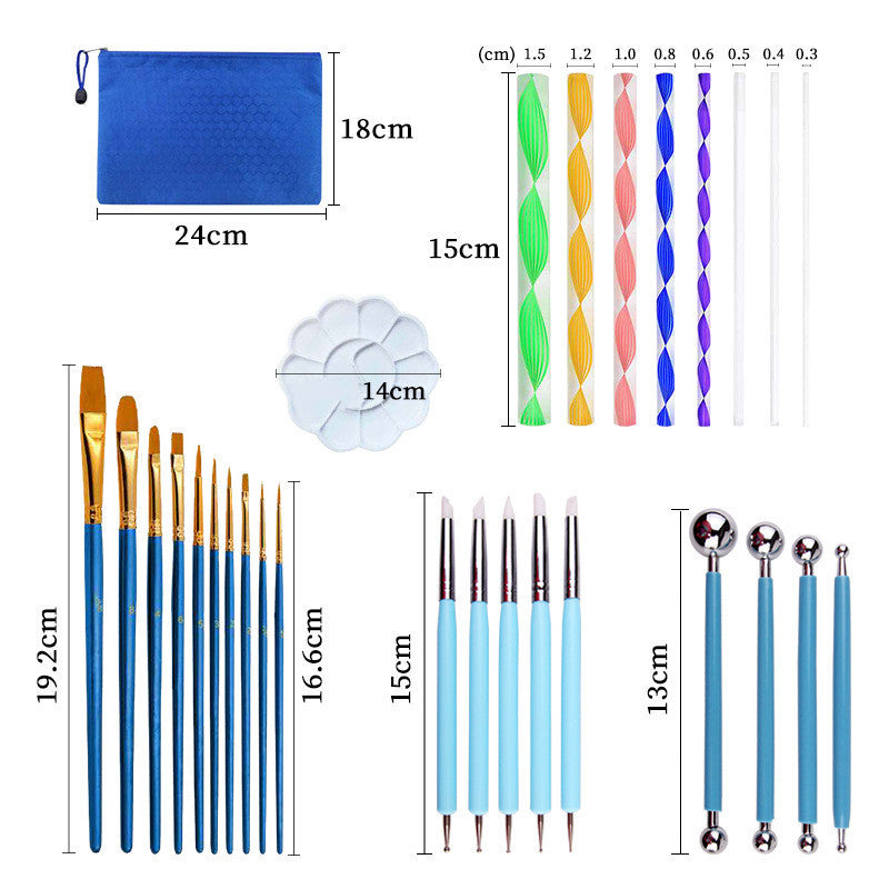 - Includes 53 pieces: templates, a brush, acrylic paints, and a paint plate.