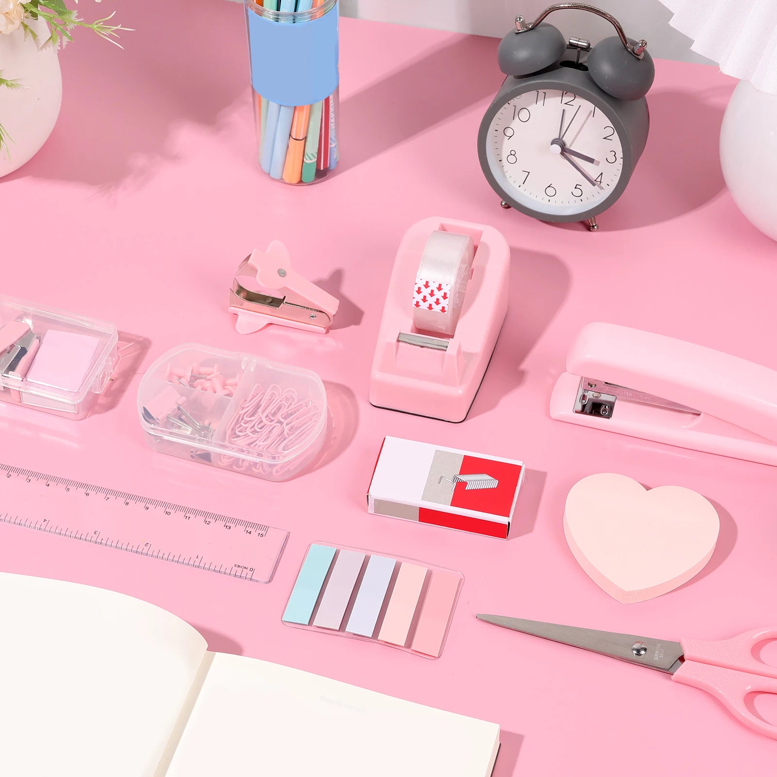 - Comprehensive contents: 1 × Stapler, 1 × Staple Driver, 1000 × Staples, 1 × Mini Stapler (with Staples), 1 × Tape Holder, 2 × Rolls of Clear Tape, 1 × Ruler, 1 × Pair of Office Scissors, 3 × Clips, 10 × Pins, 1 × Box of Paper Clips, 1 × Board of 5 Colourful Labels, 1 × Pack of Love Heart Shape Sticky Notes.