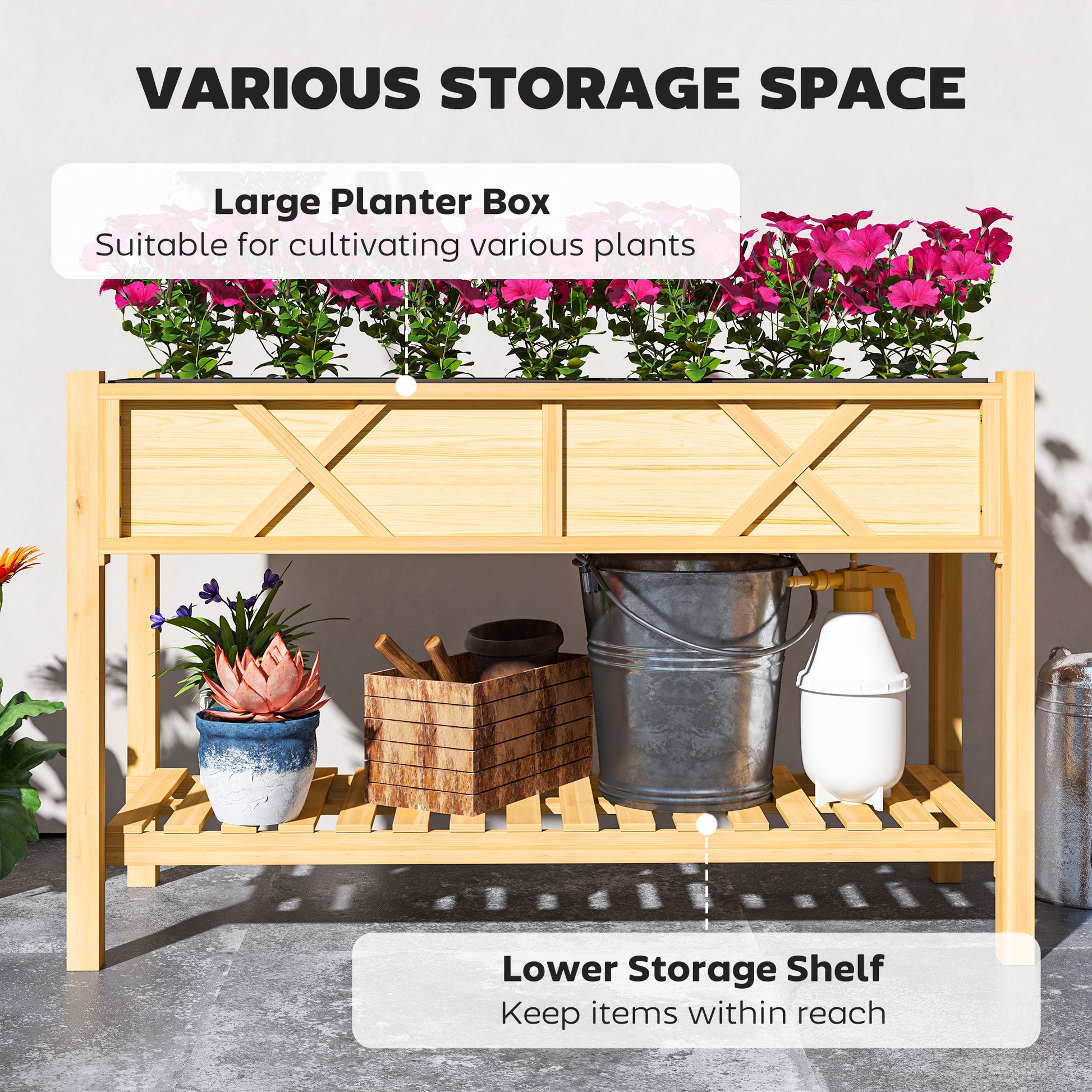 - Two-tier design allows for planting and storing essentials, keeping seeds, tools, and pots organized in one place.