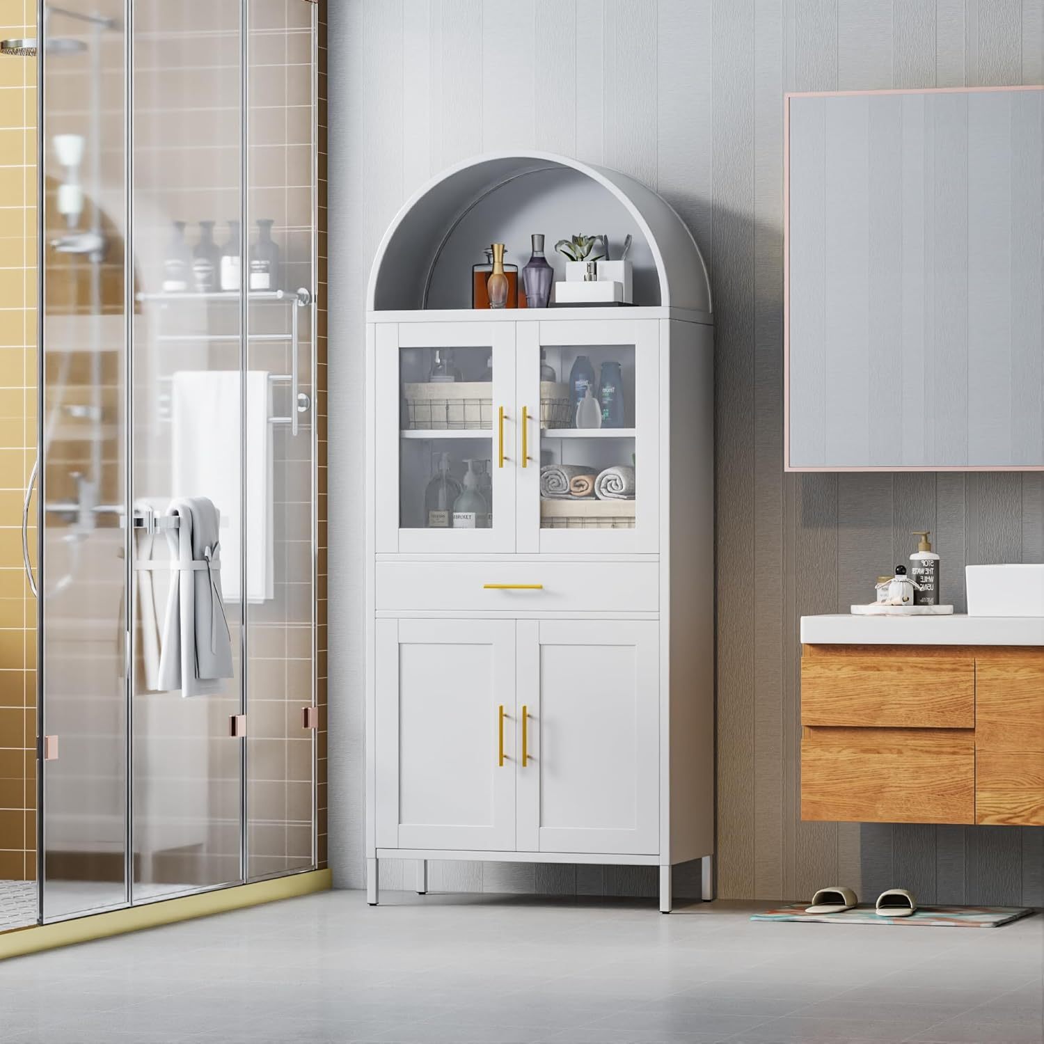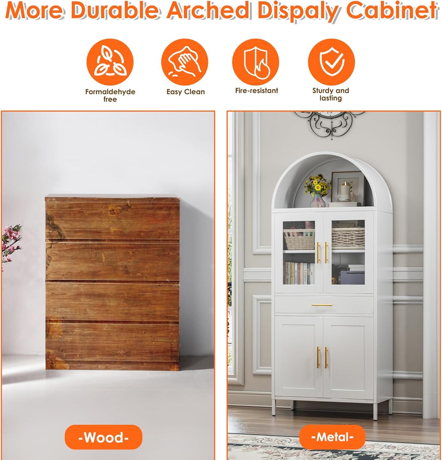 The Tall Metal Arched Display Cabinet is a stylish storage and display solution designed for homes, especially homeschool families and their kids. Its graceful arch and glass doors offer a modern vibe while keeping learning spaces organized and inviting.