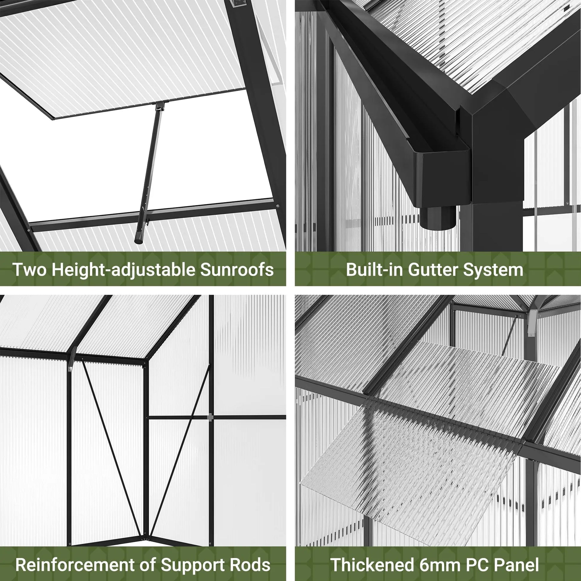 - Durable, UV-safe glazing: 6mm polycarbonate panels deliver excellent light transmission while blocking harmful UV rays.